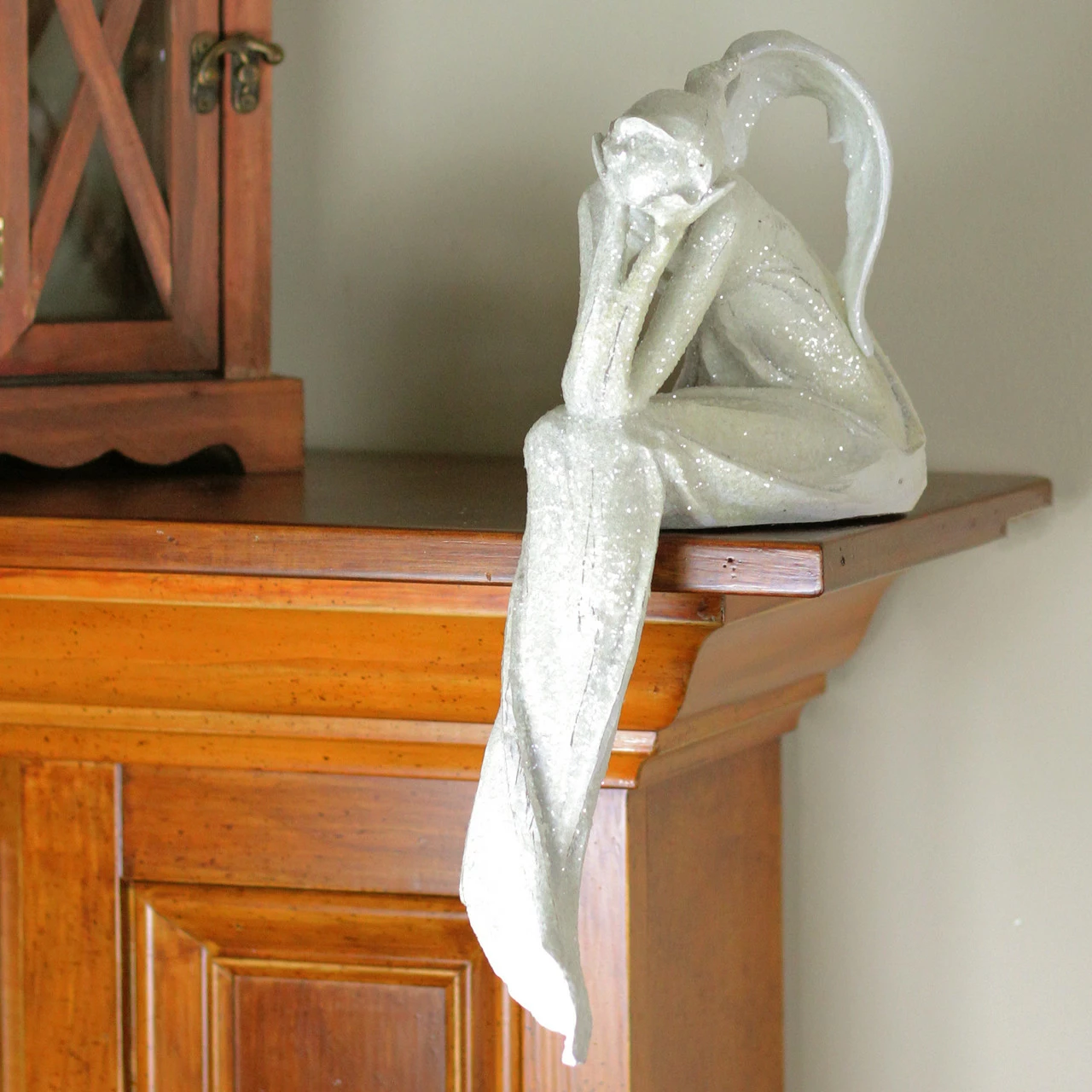 Depicts an angel sitting with her hands under her chin thinking wishful thoughts