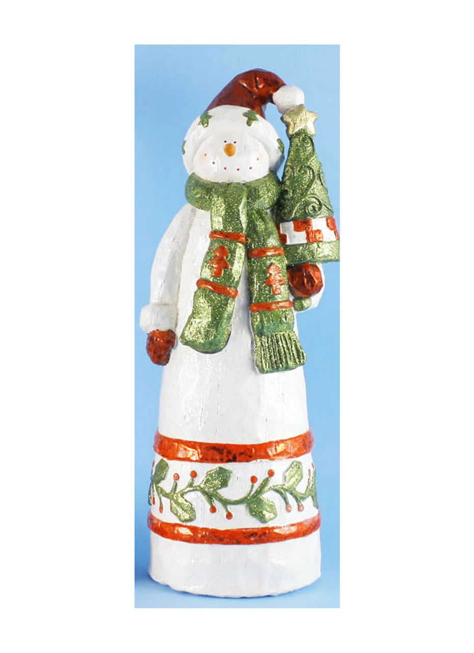 Folk Art inspired Snowman adorned in his matching red hat, gloves and scarf
