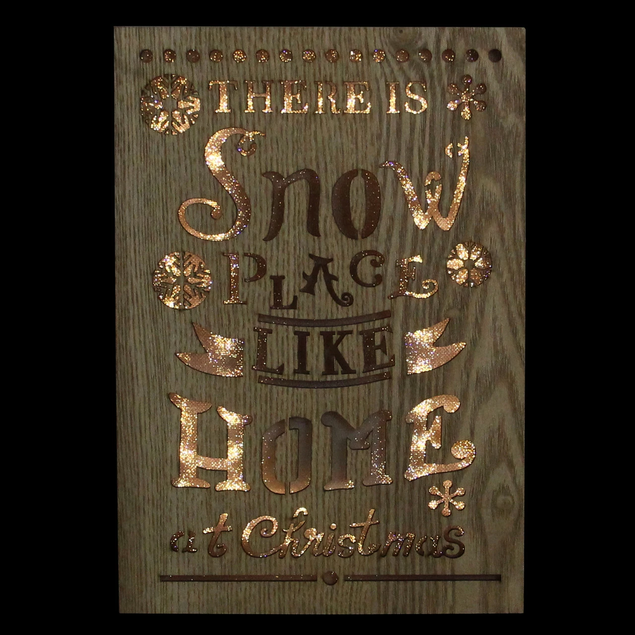 Features a wooden plaque with the words “There is Snow Place Like Home at Christmas” cut out