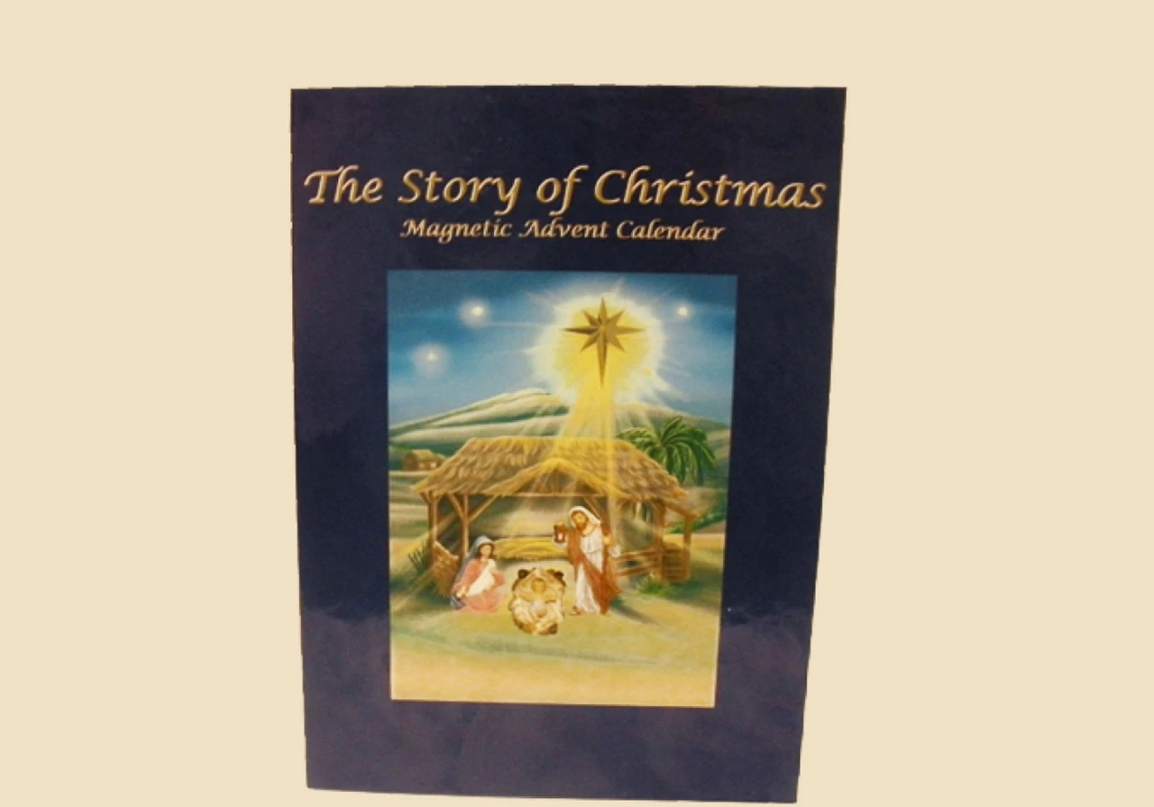 Magnetic advent calendar includes a reusable nativity scene storyboard with an explanation of each figure and symbol