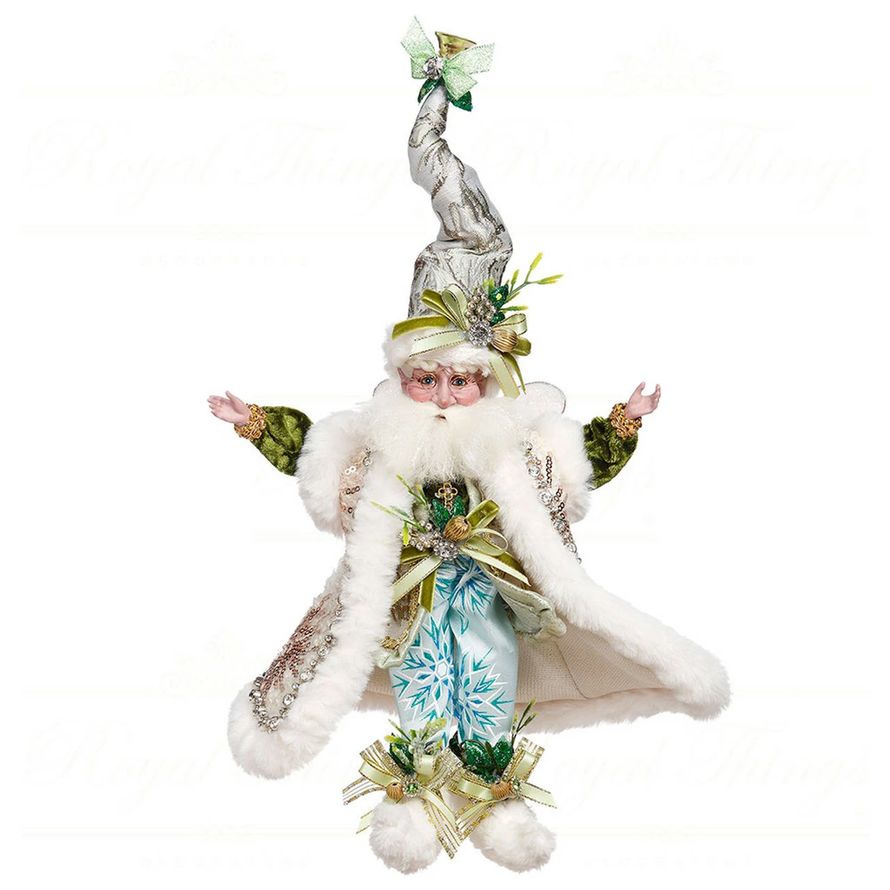 Dressed in a green, white, ivory and blue festive outfit