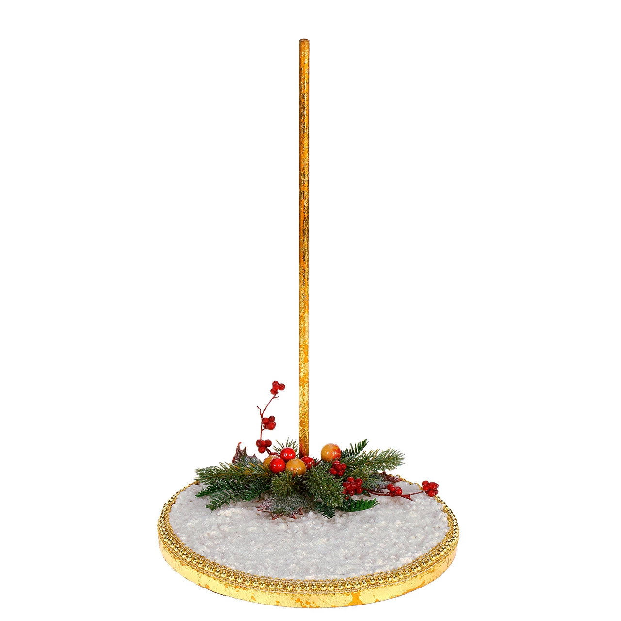 Snow base covered in iridescent glitter with golden ribbon and sequins around the edge