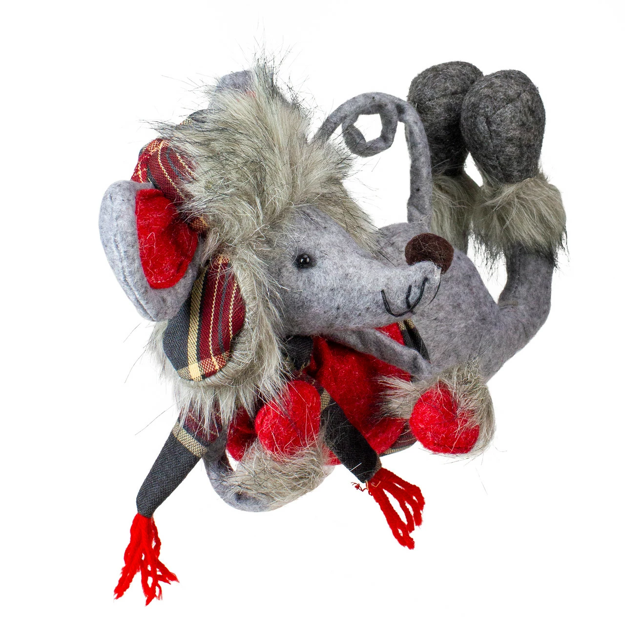 He has fuzzy red gloves and decked out with big grey feet