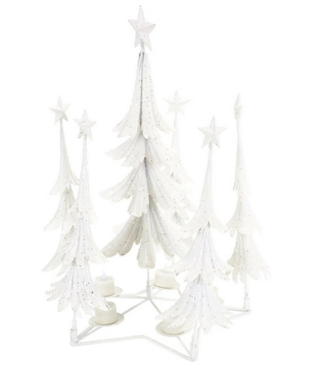 Sparkling candle holder with a white and silver glittered Christmas tree design