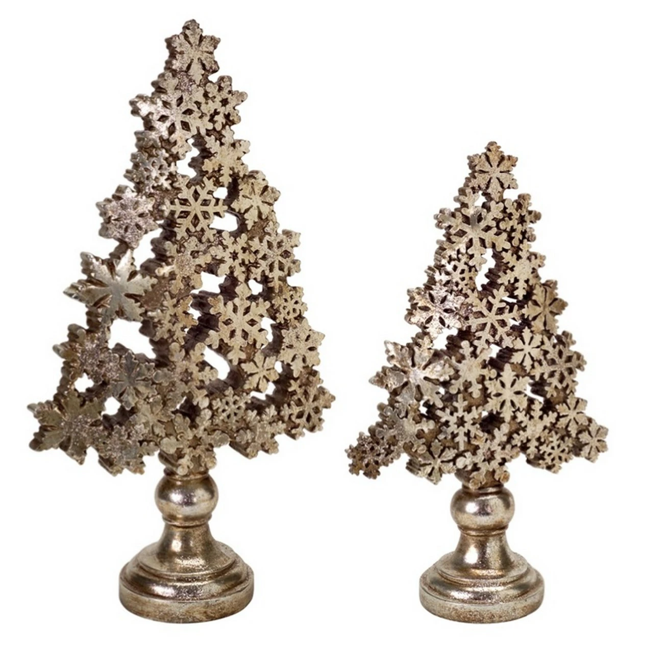 Features a beautiful antique brass and champagne gold colored large and small Christmas tree