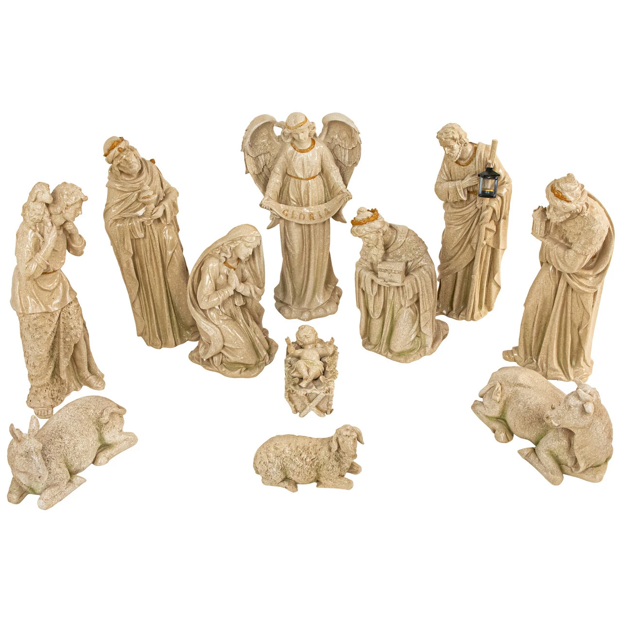Set includes the Holy Family, 3 Wise Men with gifts, a shepherd with sheep, sheep, cow, donkey, and an angel