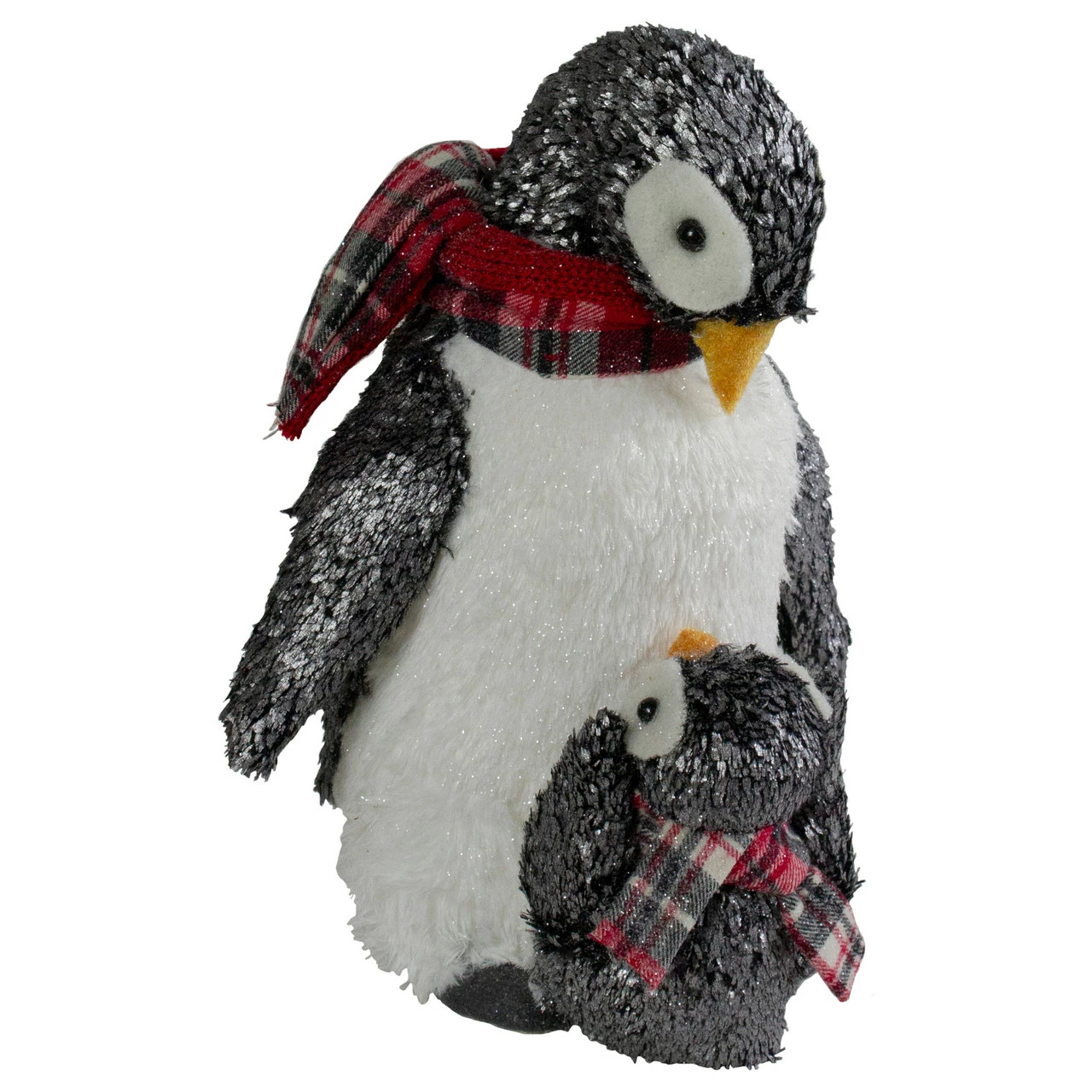 Mother penguin wears a two-sided scarf- plaid on one side, red knit on the other