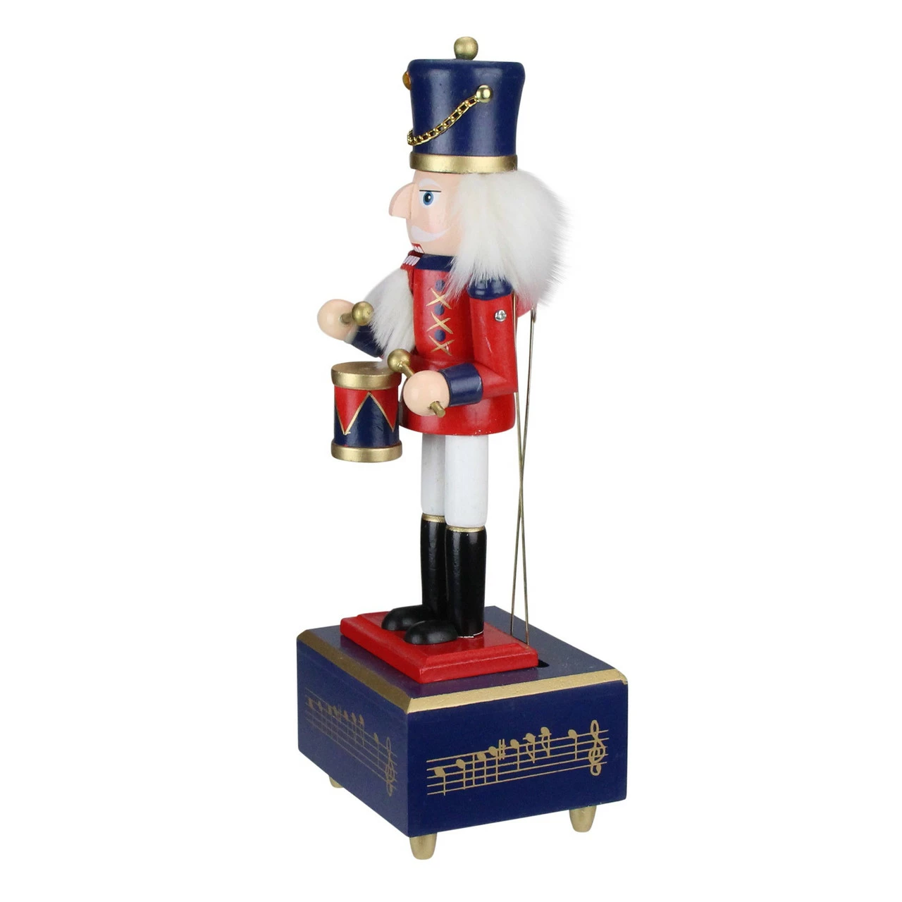 Traditional nutcracker is posed playing the snare drum while dressed in a red, white, blue and gold band uniform
