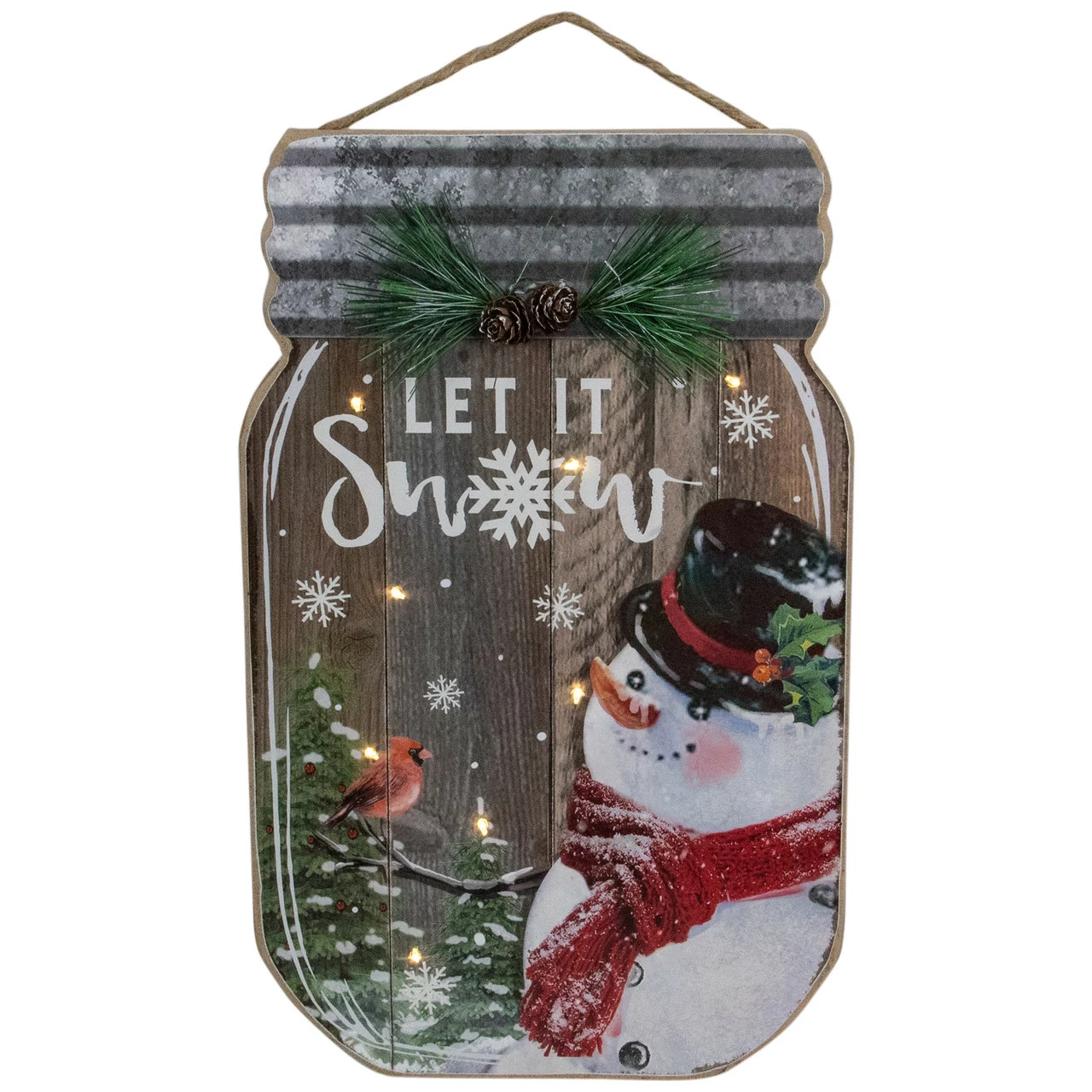 Features a snowman wearing a black top hat with holly berries and a red scarf