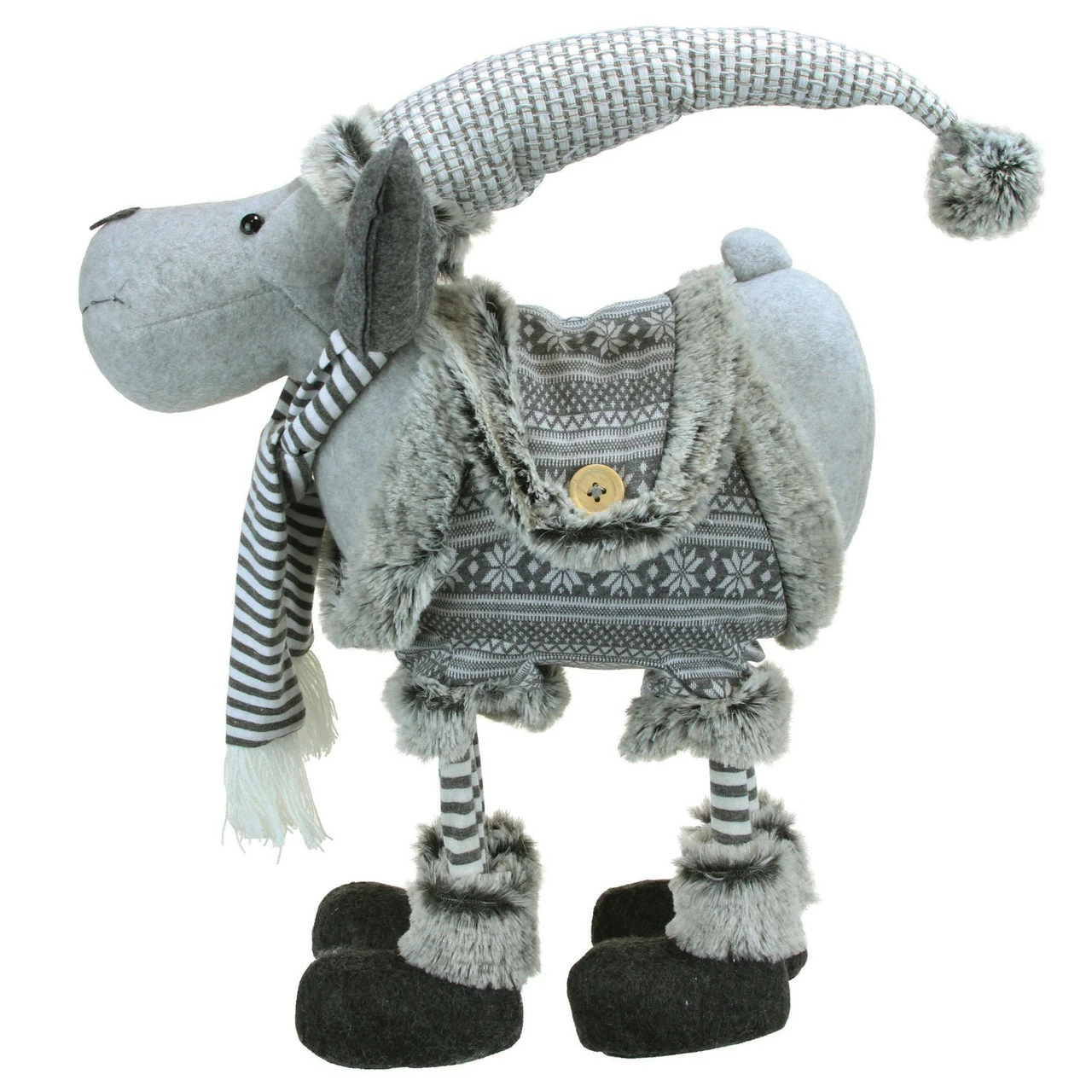 Moose is wearing a gray Nordic sweater and gray boots with faux fur trim