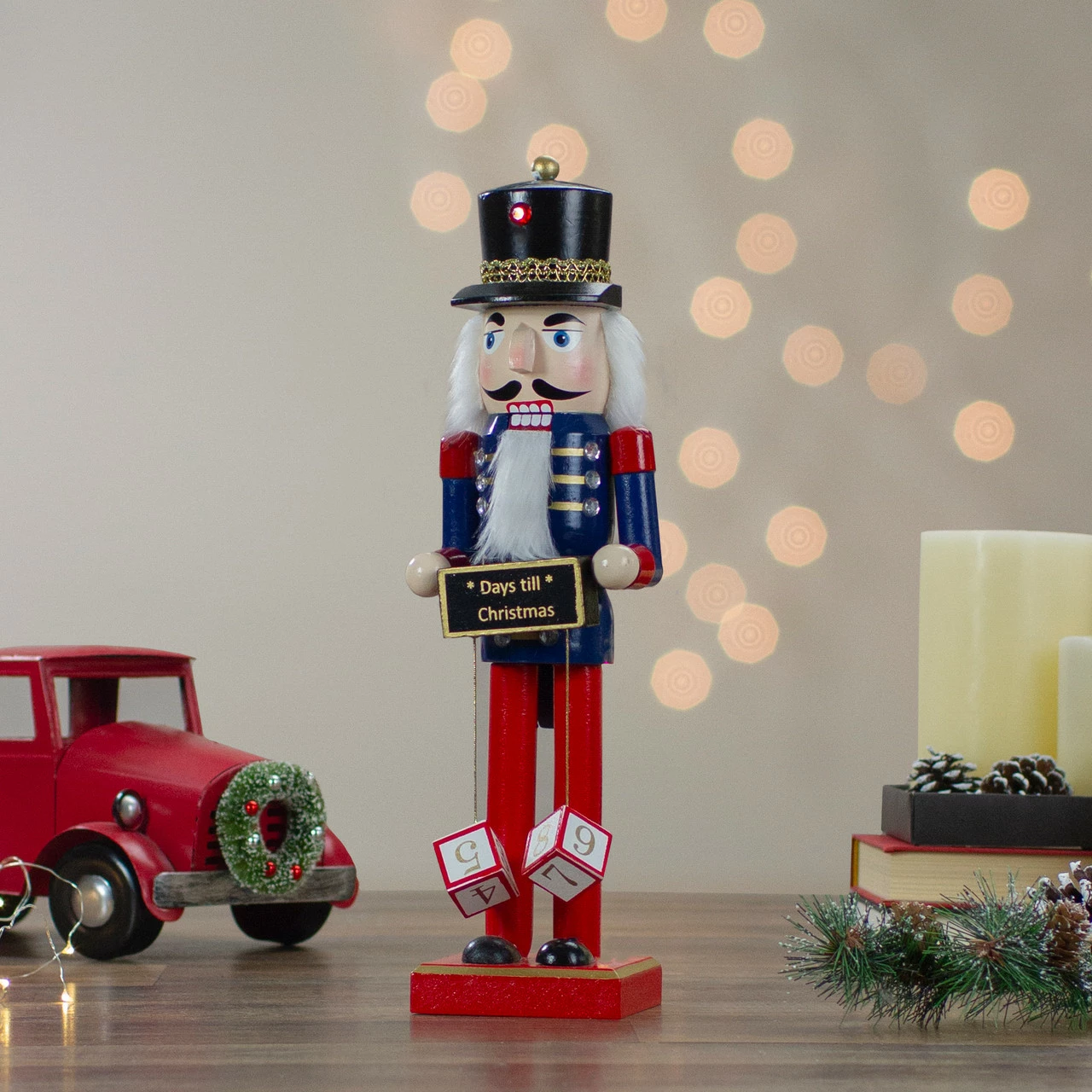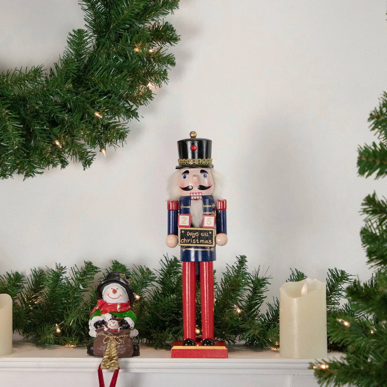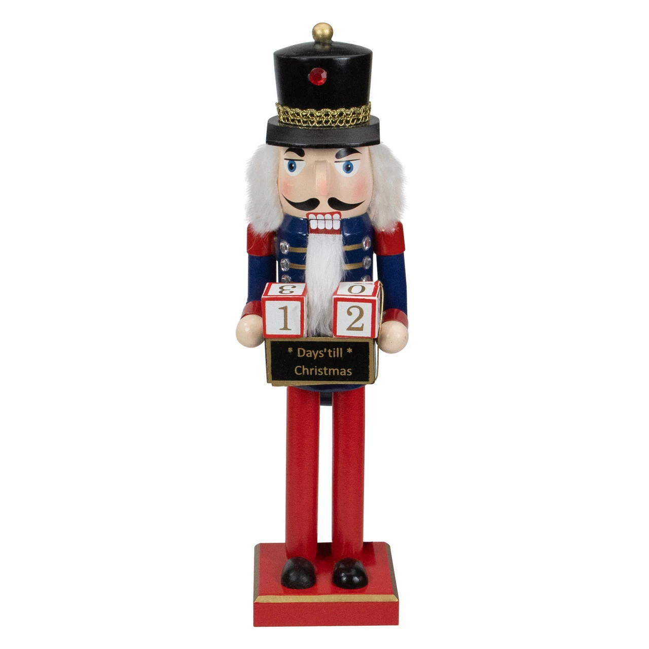 Traditional nutcracker soldier wears jacket featuring clear jeweled accents with red pants