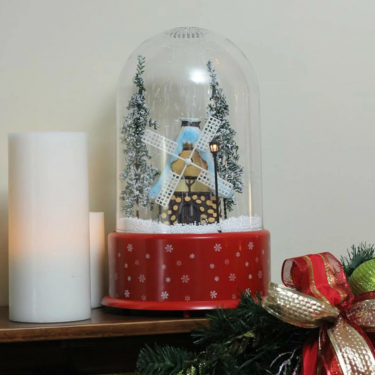 Cascading snowfall effect creates the look that it is actually snowing inside this winter scene dome