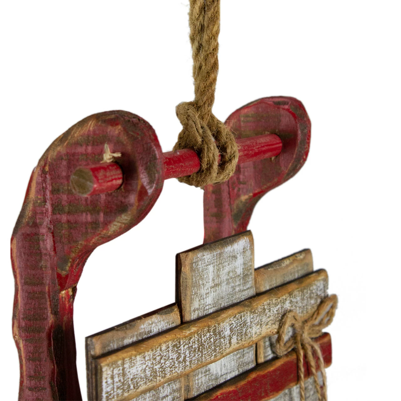 Rustic jingle bells and snowflake are hanging on the top by jute rope