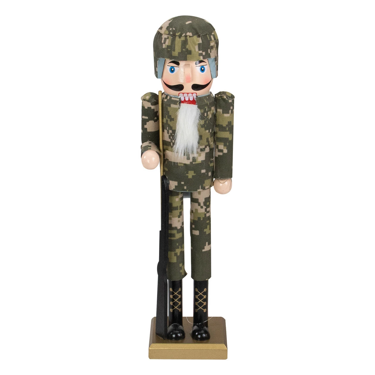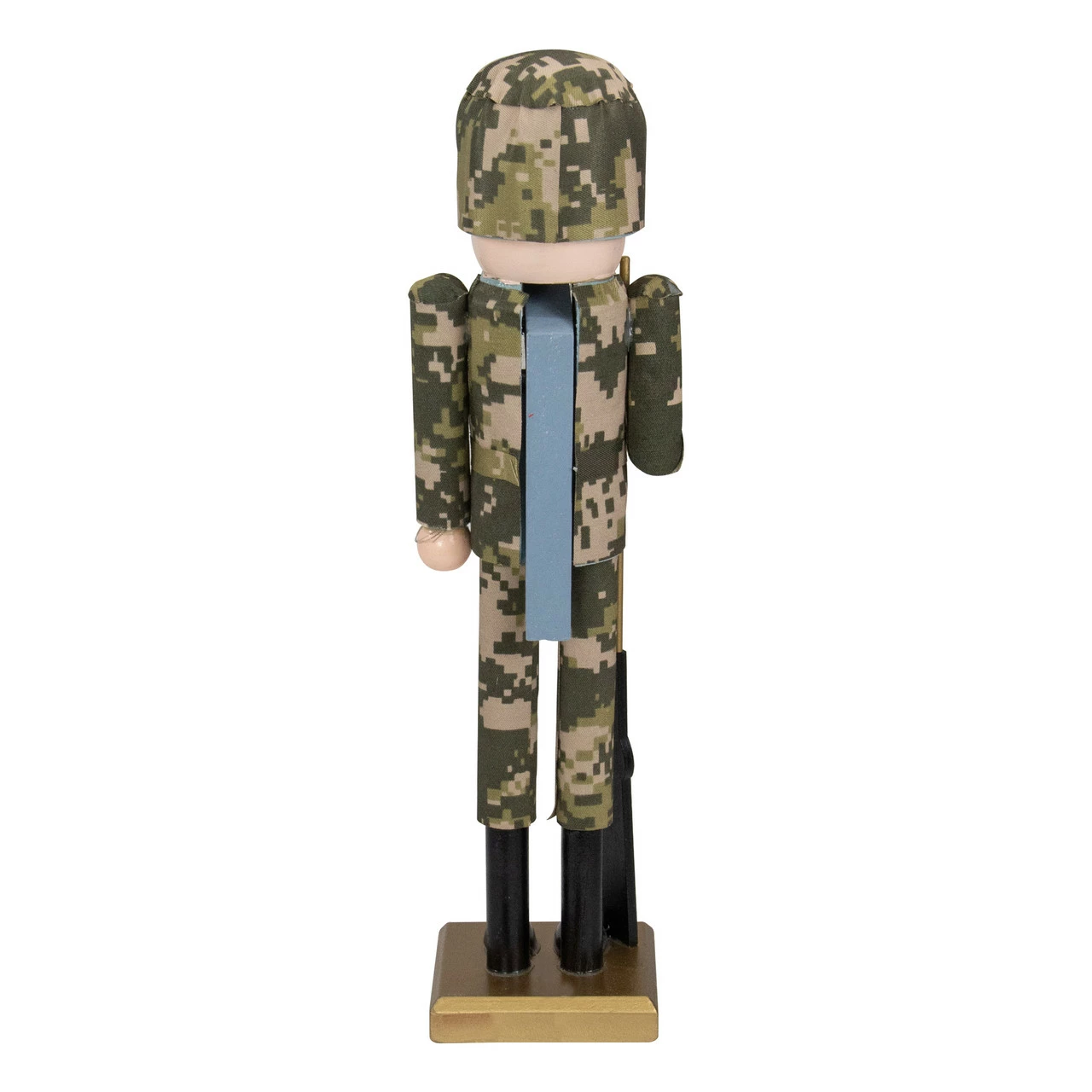 Nutcracker soldier is wearing a green army fatigue uniform