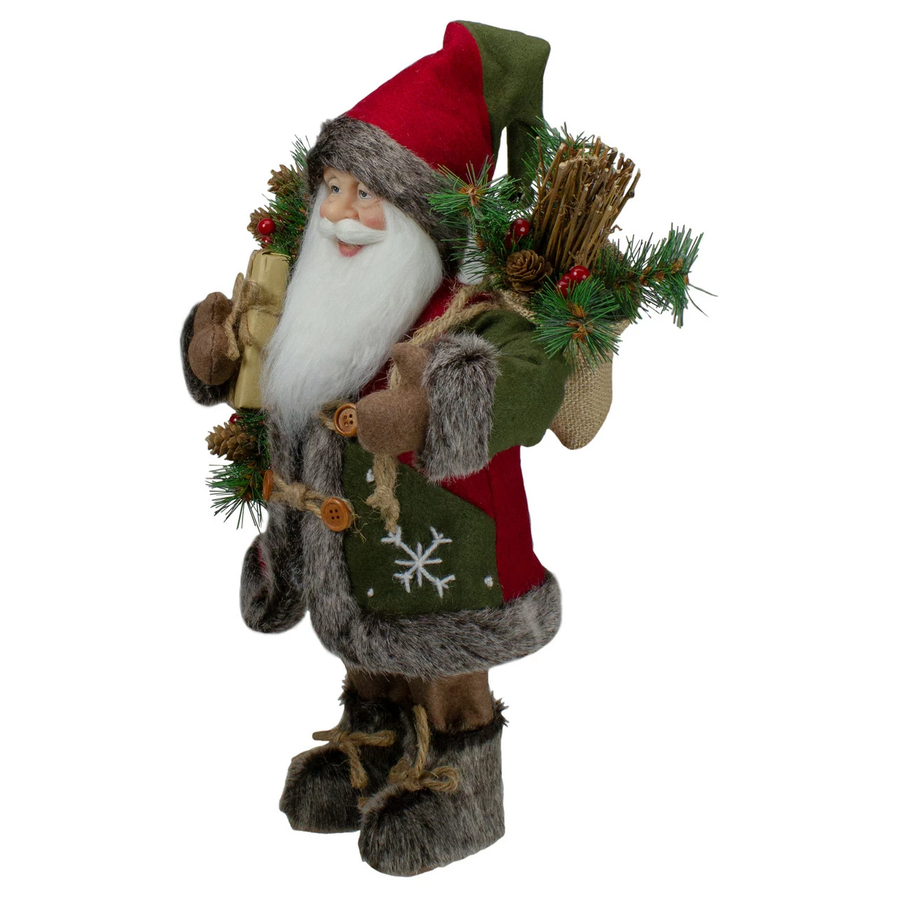 Present and sack are accented with pine needles, pinecones, twigs, and berries