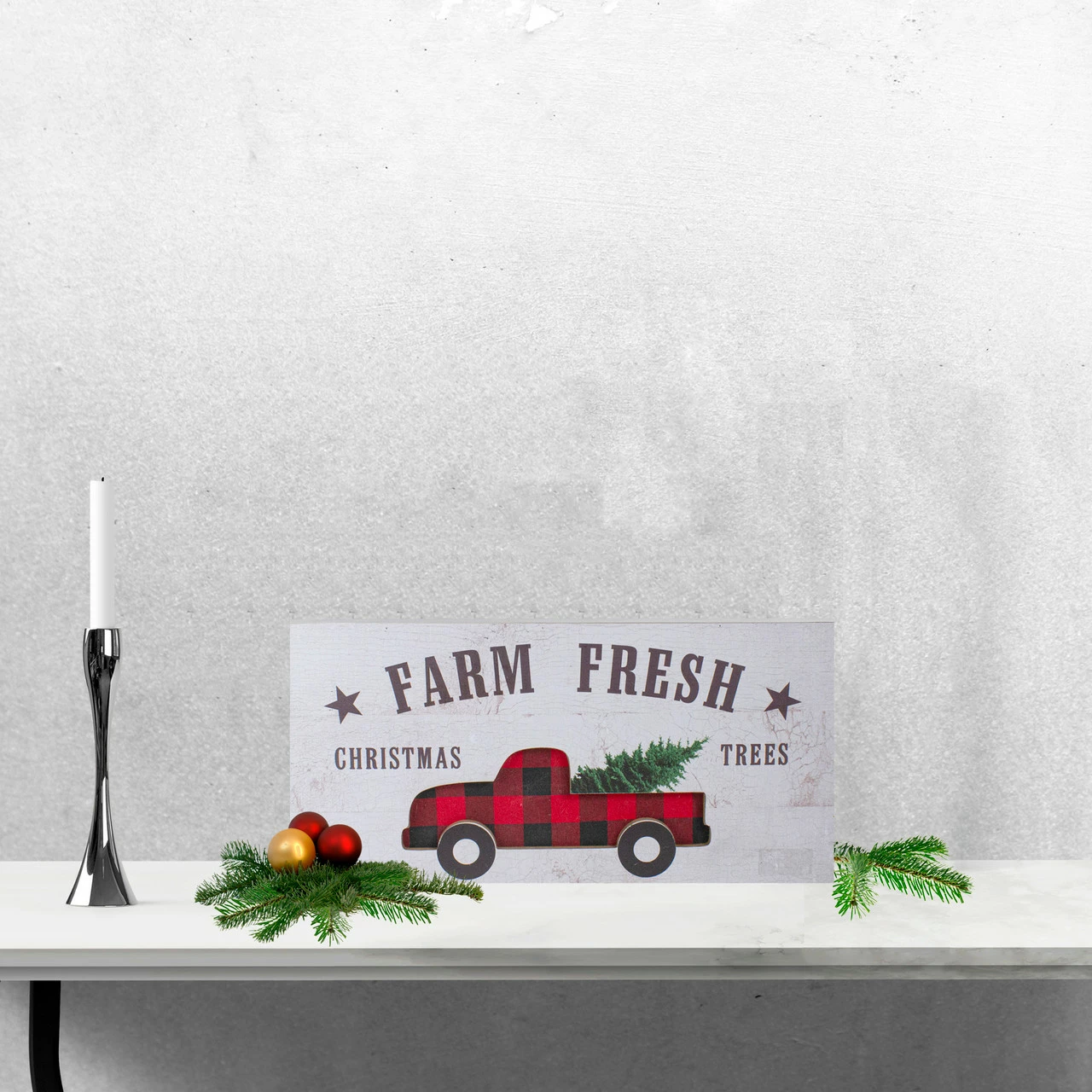 Script in brown reads: Farm Fresh Christmas trees