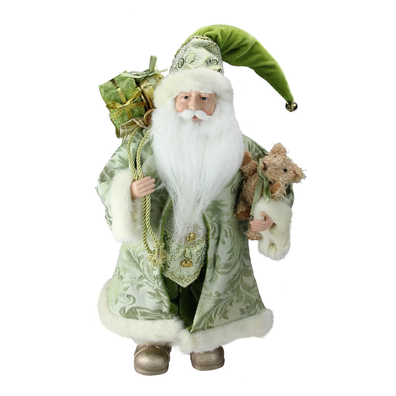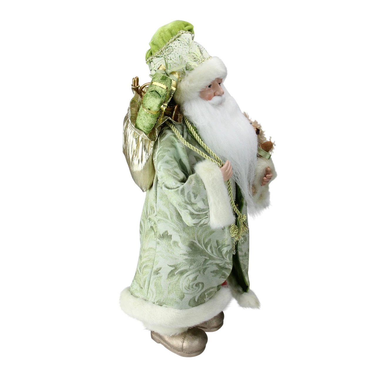Features Santa wearing a green coat with a jacquard pattern and a faux fur trim