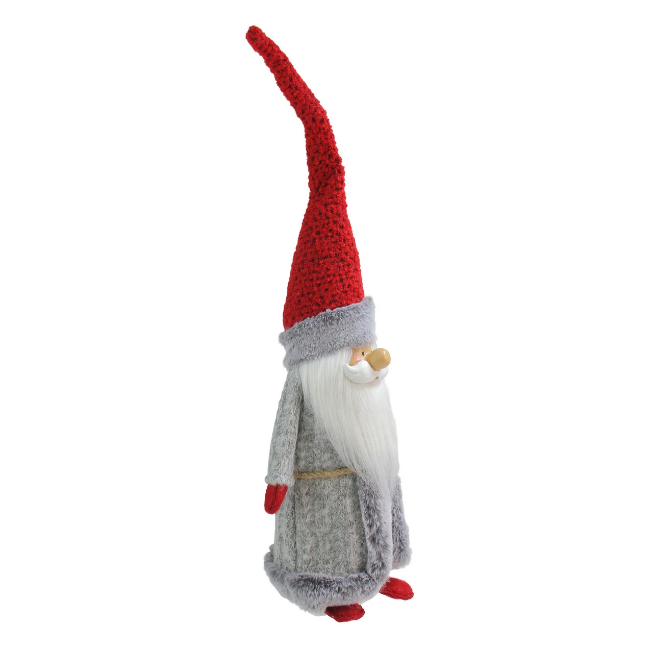 Gnome wears a light gray faux fur coat with twine belt