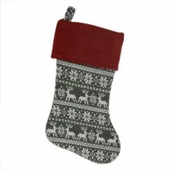 Stocking features simplistic linear design with reindeer and floral snowflake style accents and a combination of knit and faux-wool textures