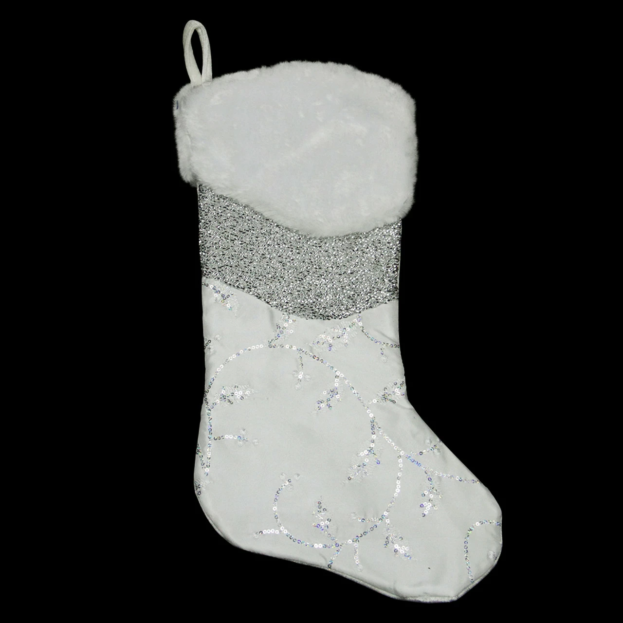 Stocking features a white overlay accented with iridescent sequined leaves and metallic silver weaves