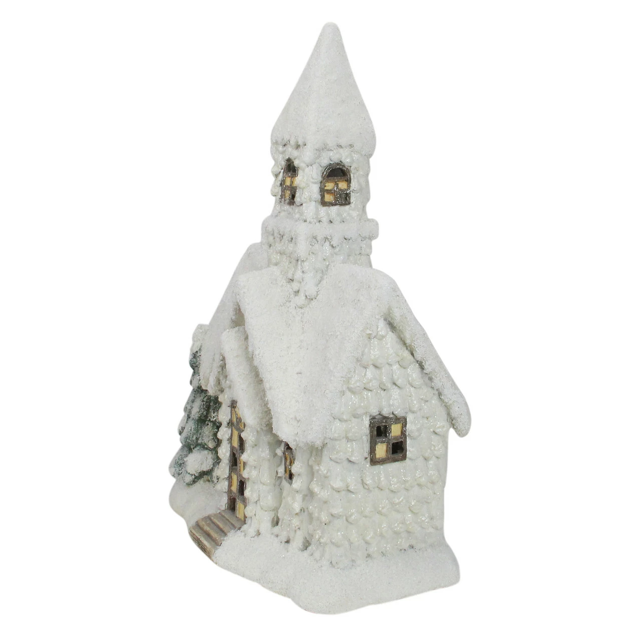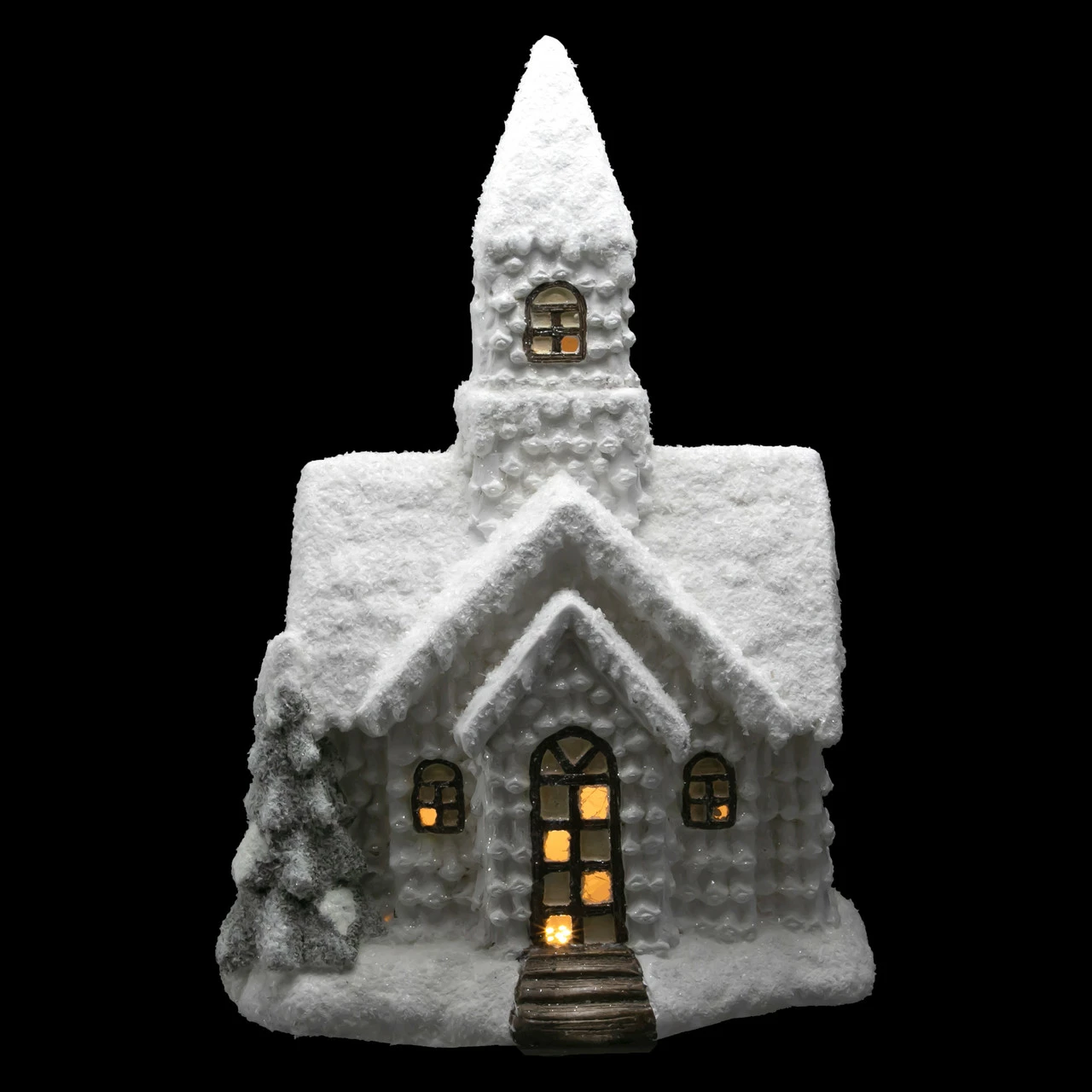Church is designed with a steeple and a pine tree on the side