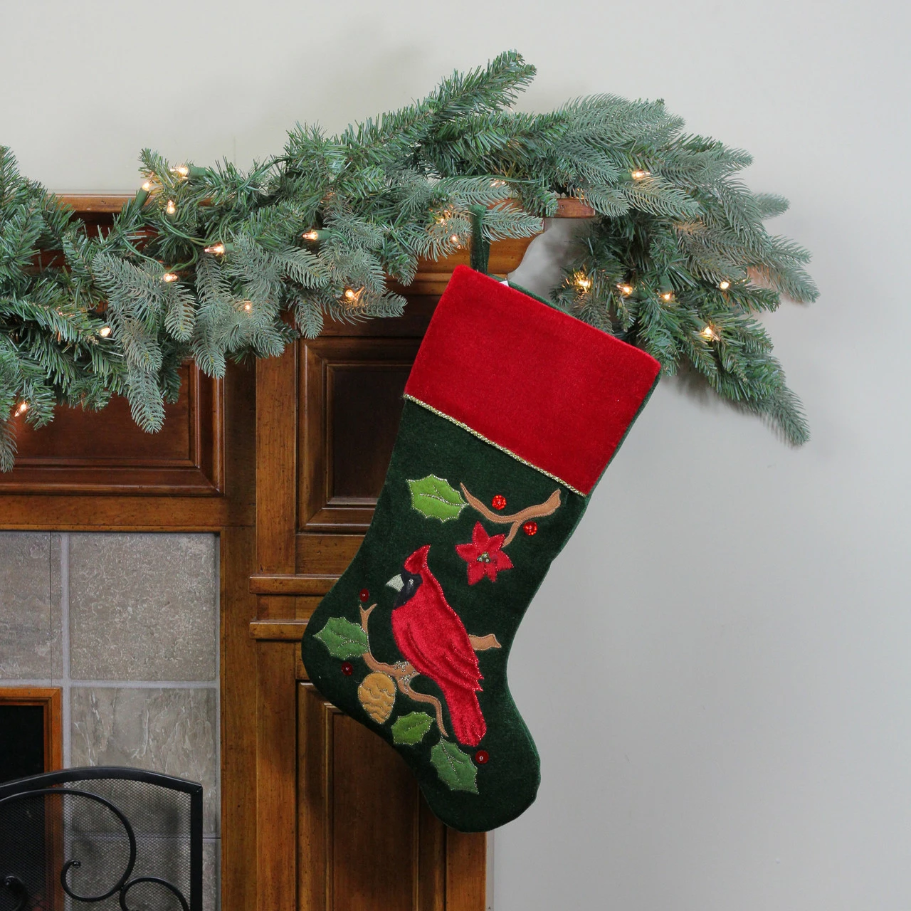 Cardinal on a tree branch with pine cones, holly leaves and berries