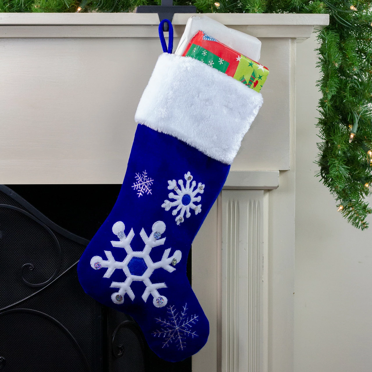 White and blue applique and silver embroidered snowflakes