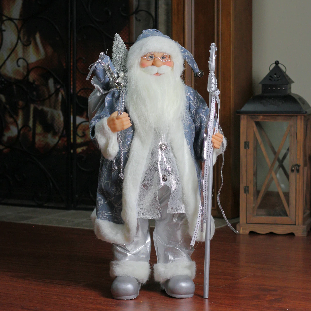 Features Santa in a blue and silver suit accented with faux fur and snowflakes