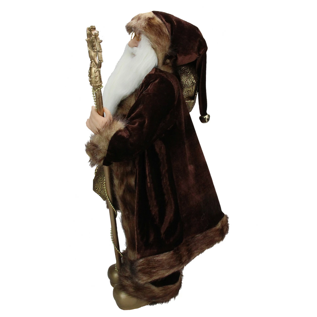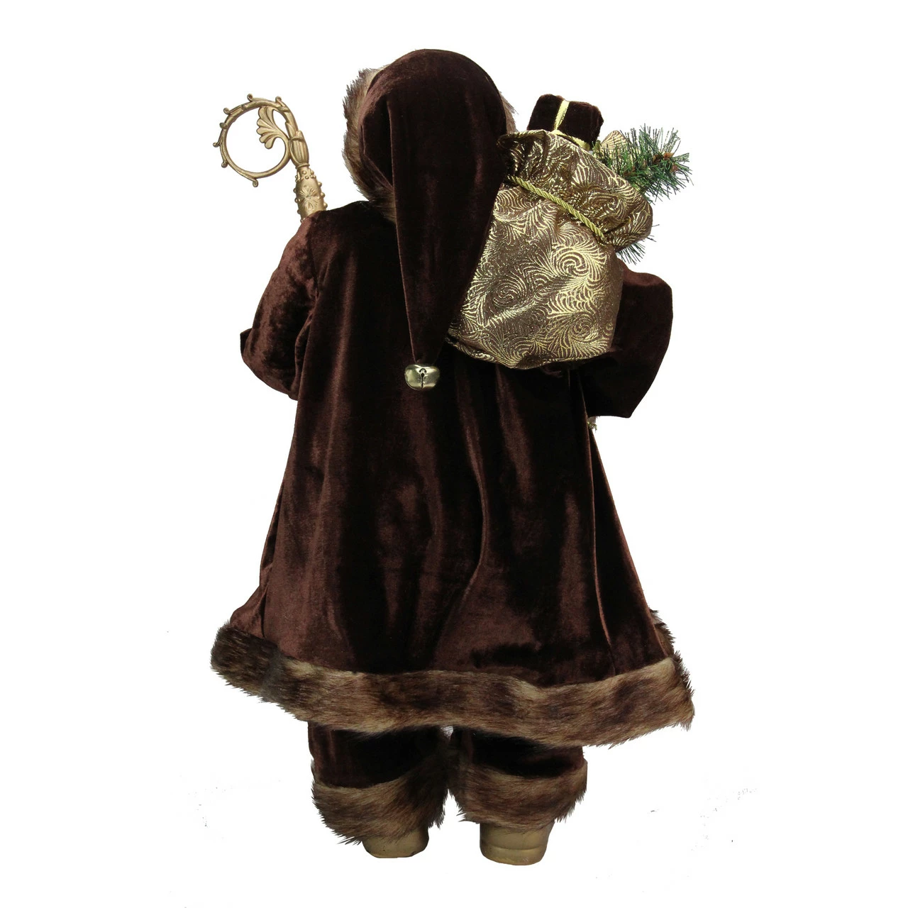 Equipped with a bronze sack full of gifts, gold horn, pine sprigs and majestic golden staff