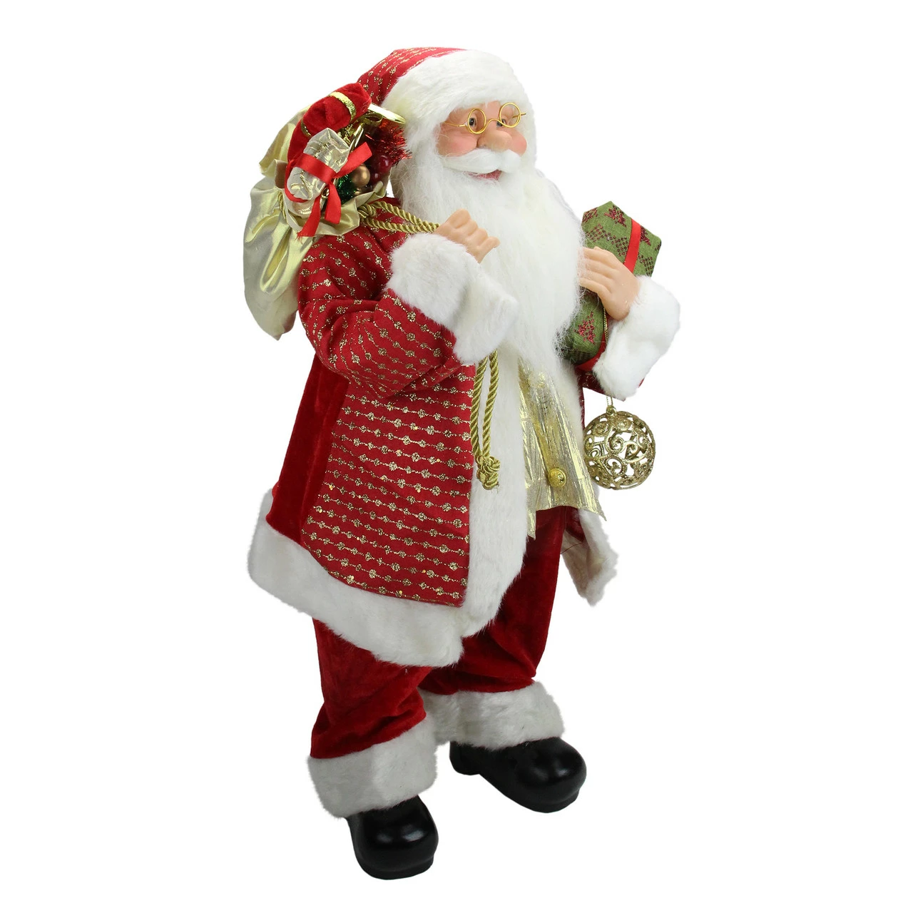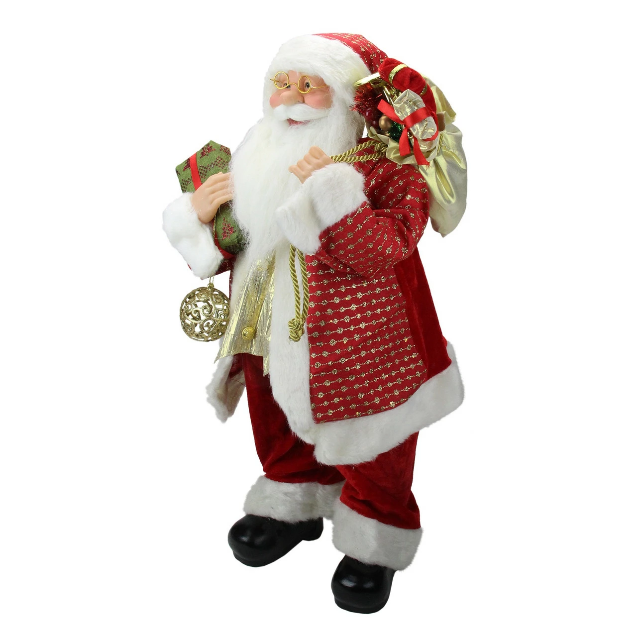 Santa is wearing a red coat, pants, and hat with gold accents and faux fur