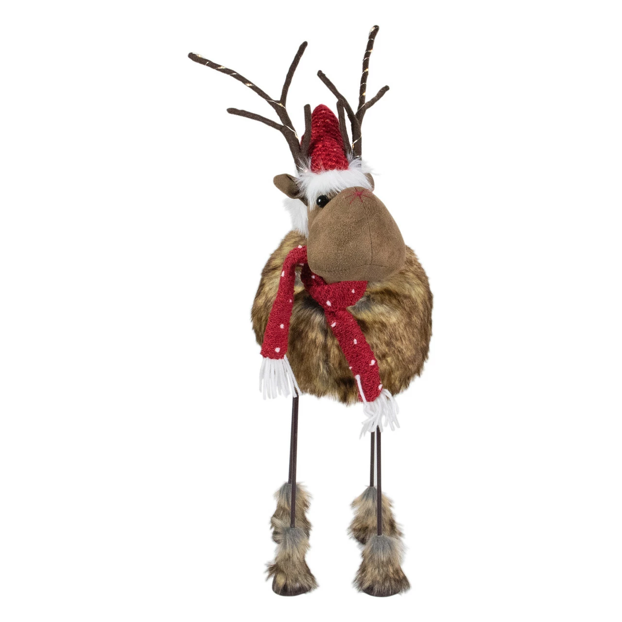 Features the reindeer wearing a red and white scarf with a Santa hat