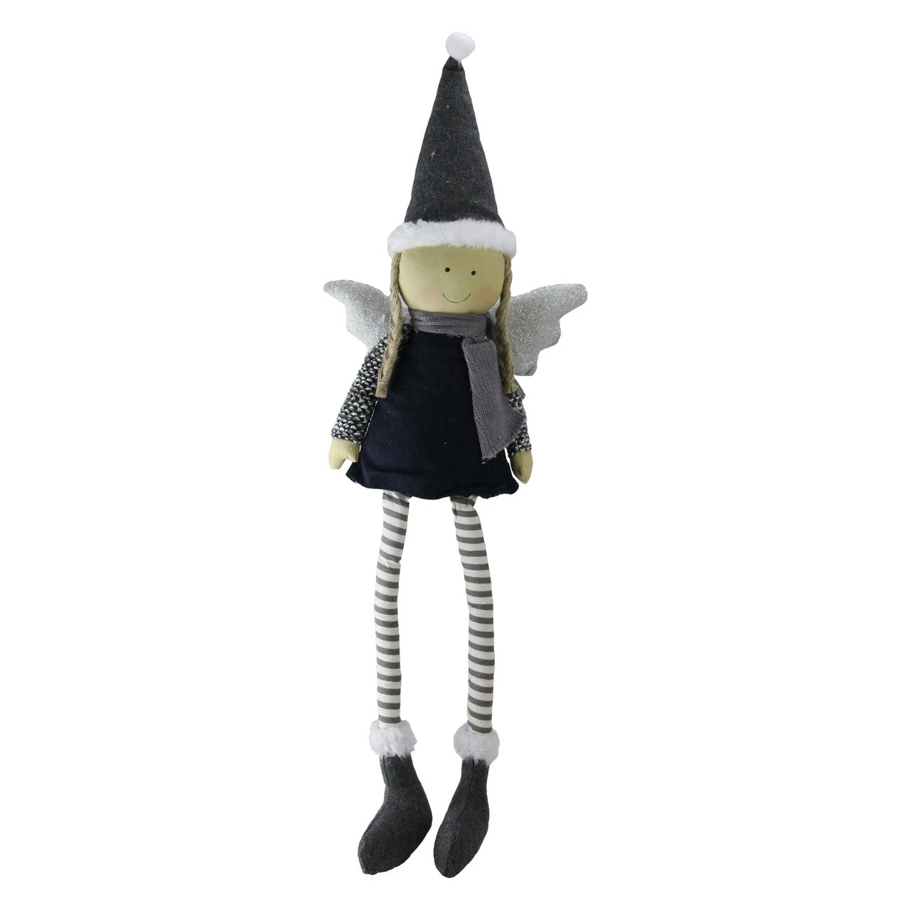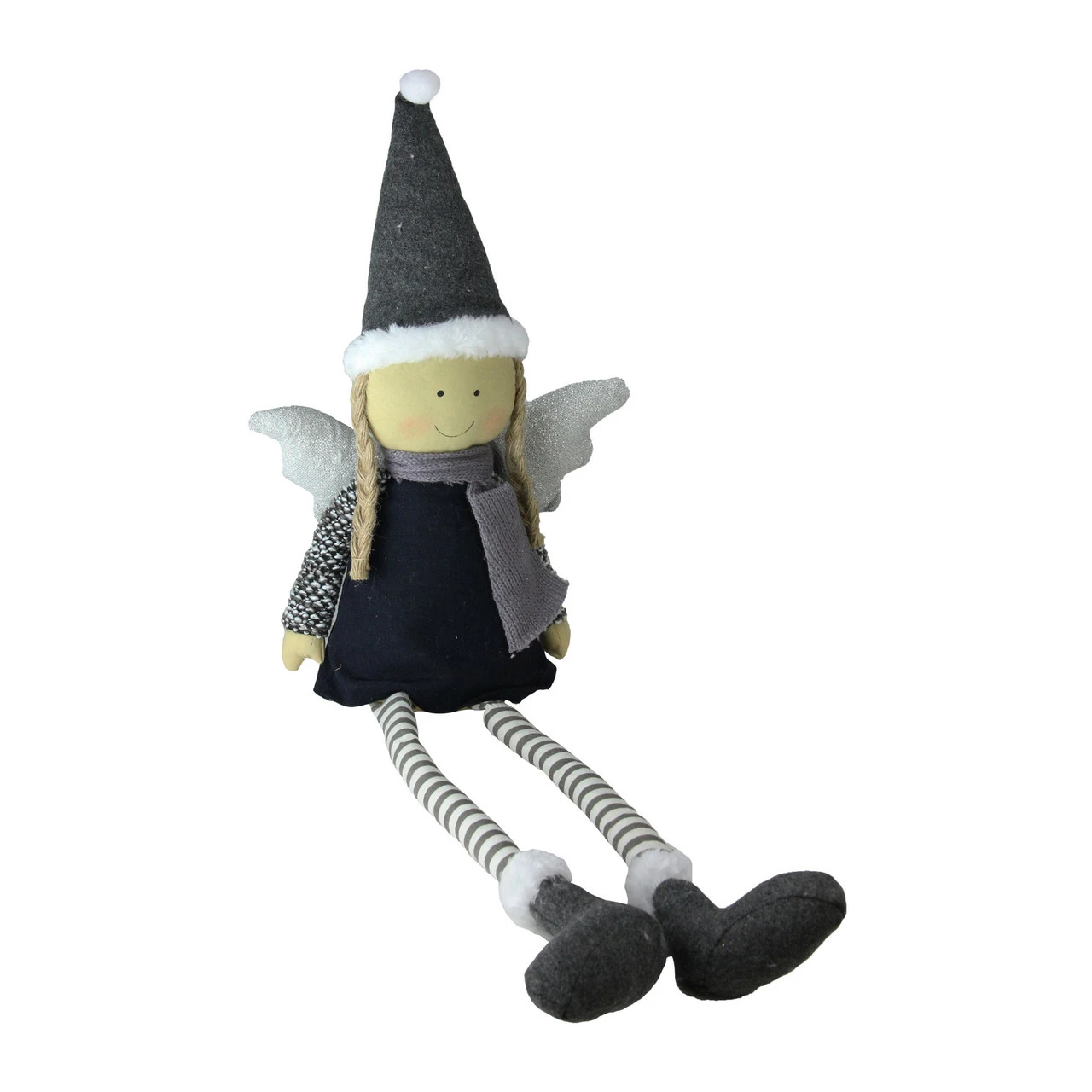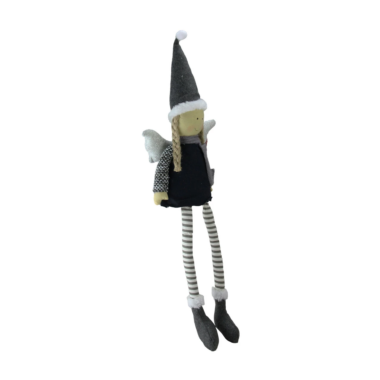 Features a gray knit coat, ivory-colored pants, striped leggings, gray wings and a cute gray hat trimmed with faux-fur