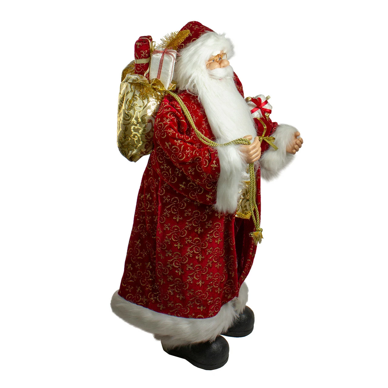 Bag of presents is over Santa’s shoulder while he is carrying more gifts in his other hand