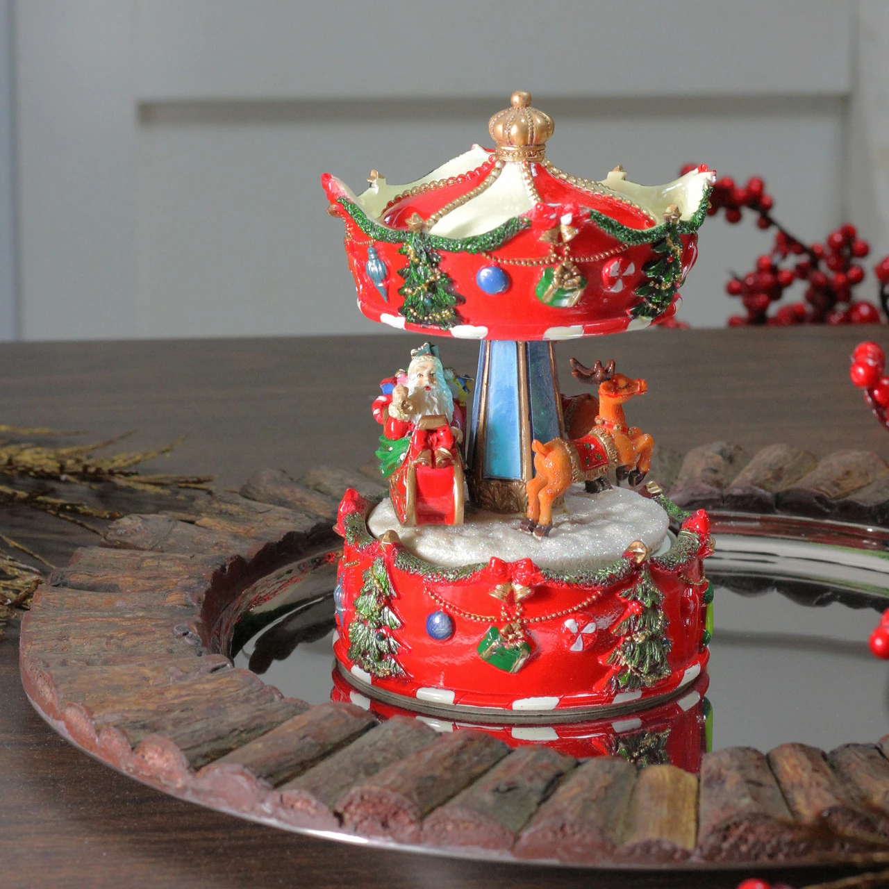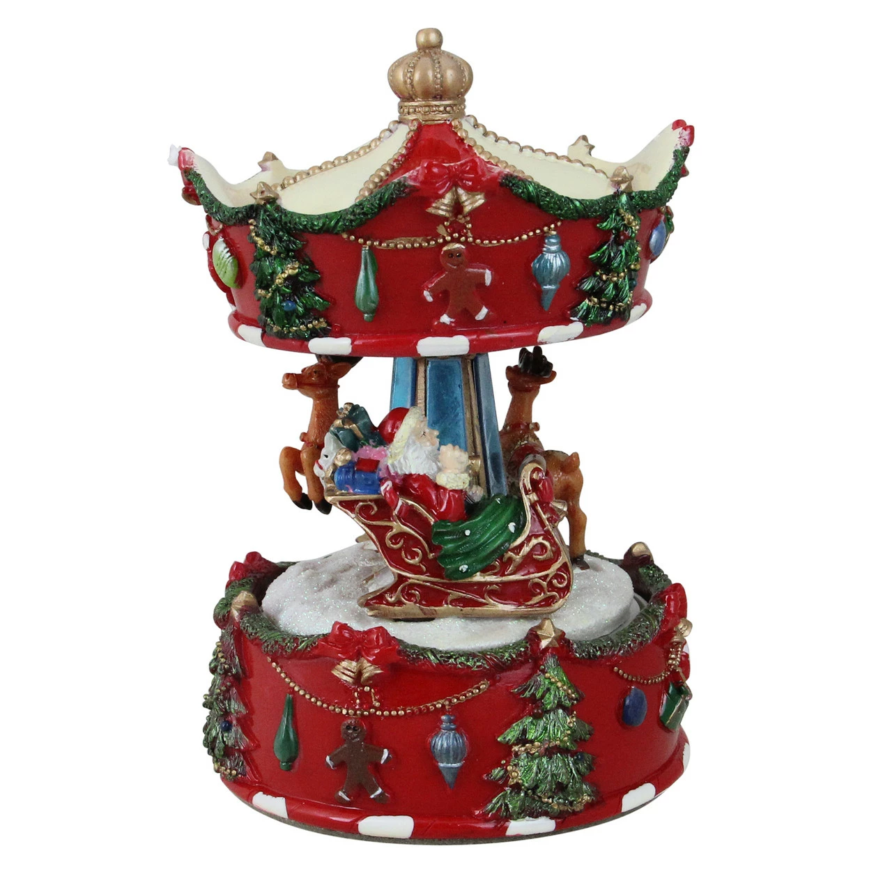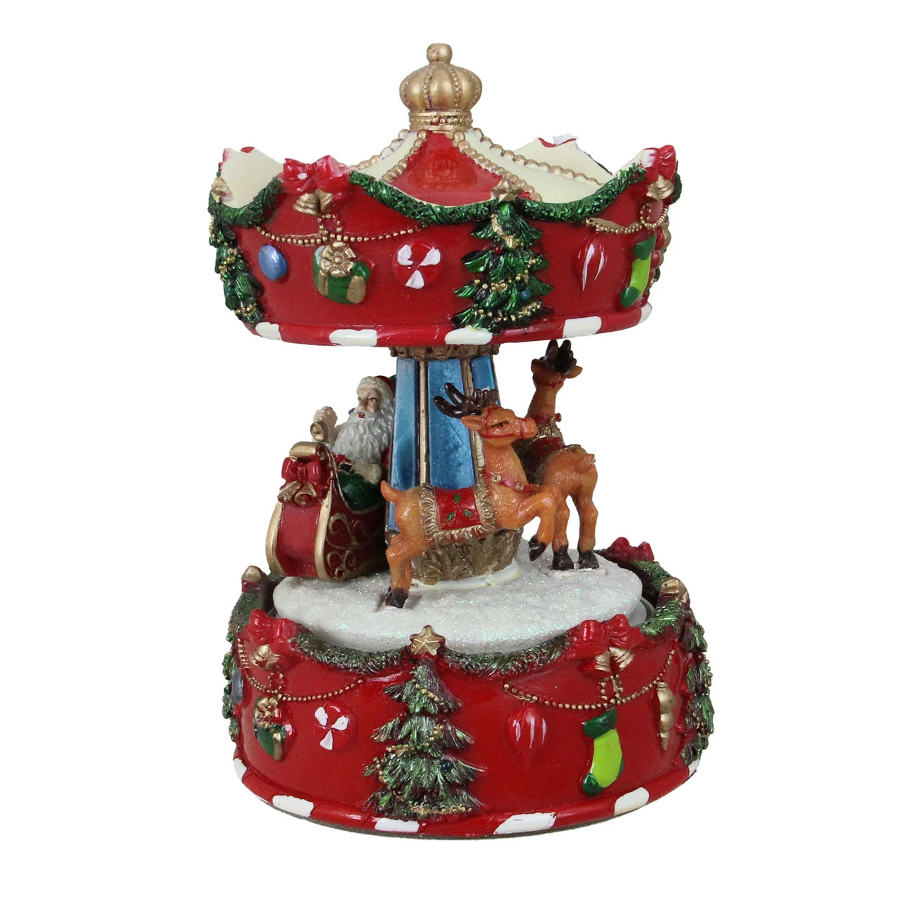 Features Santa and reindeer carousel rotating around a red base