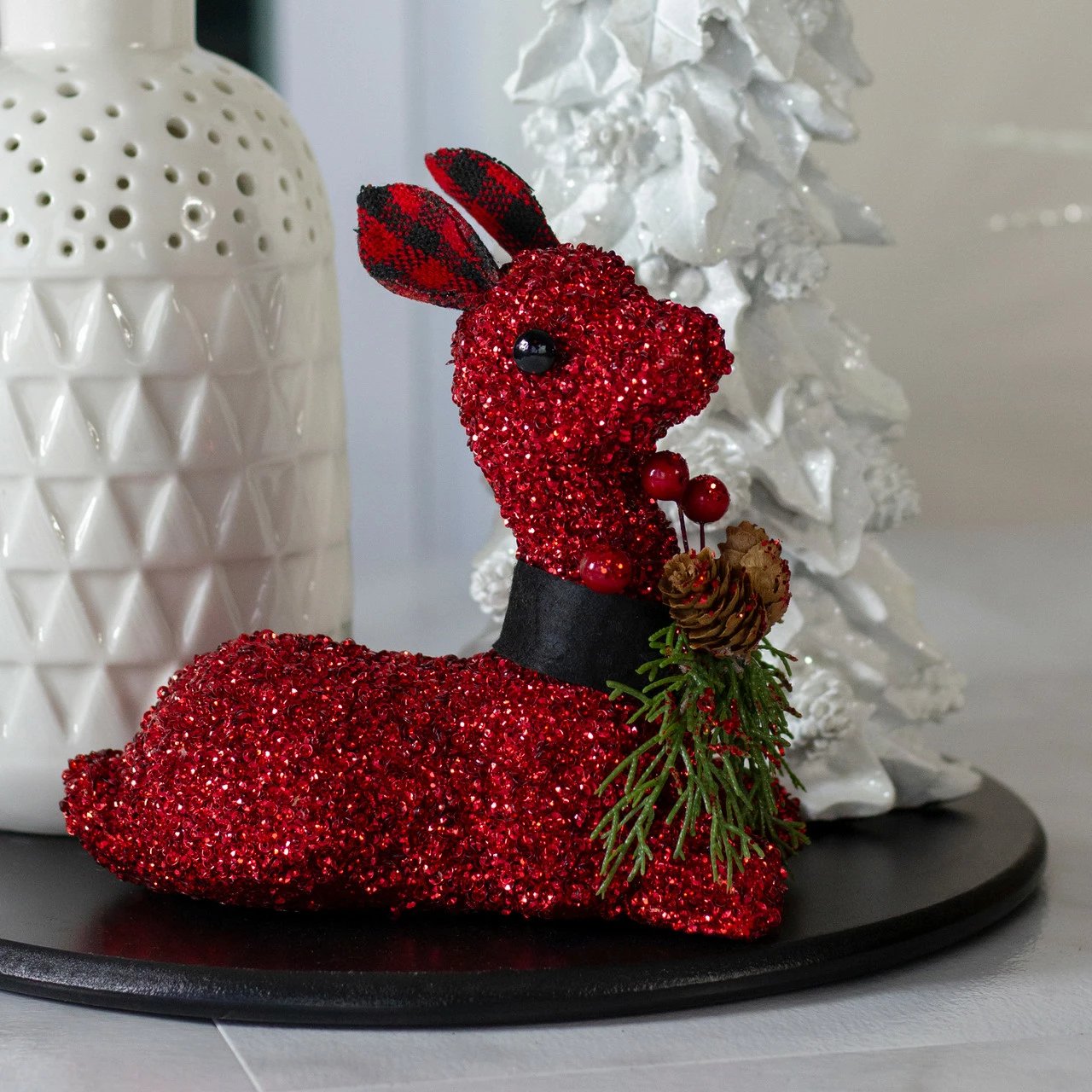 Sitting reindeer designed with a red sequin body