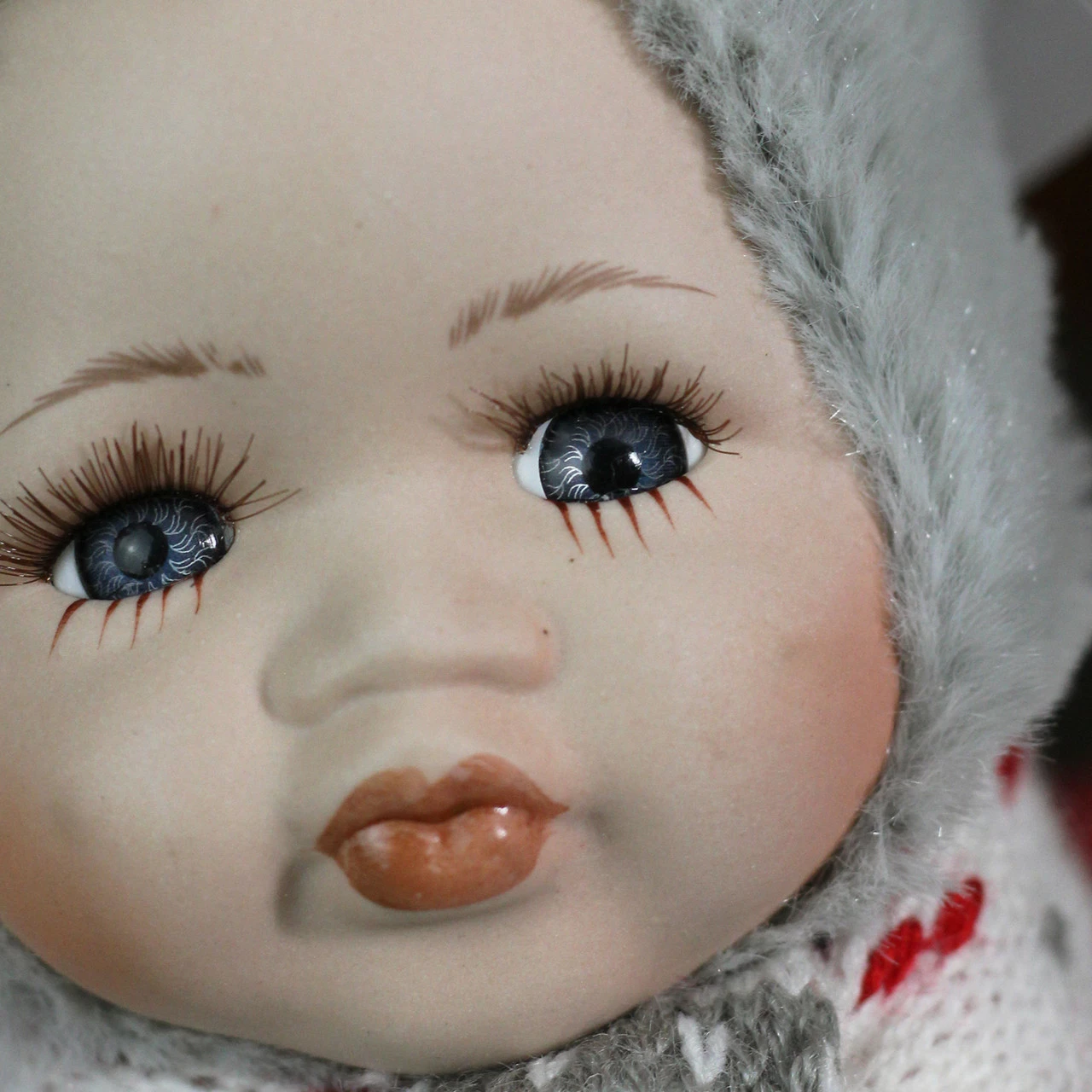 The kissing face is made of porcelain with rooted eyelashes and bright blue eyes