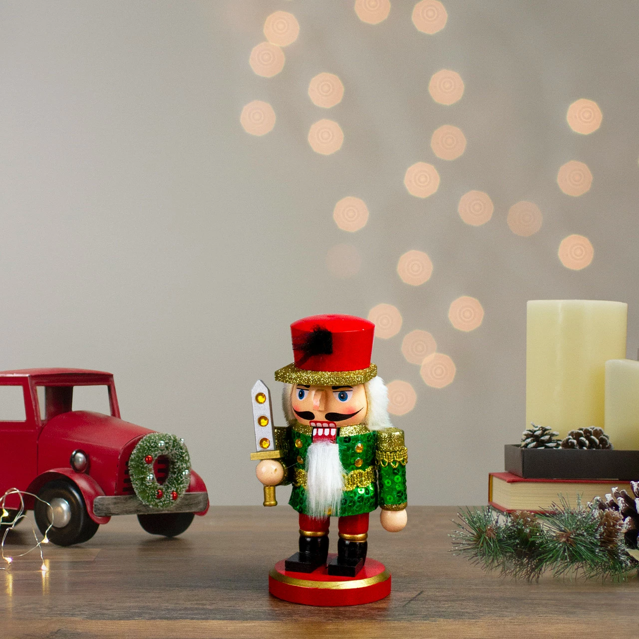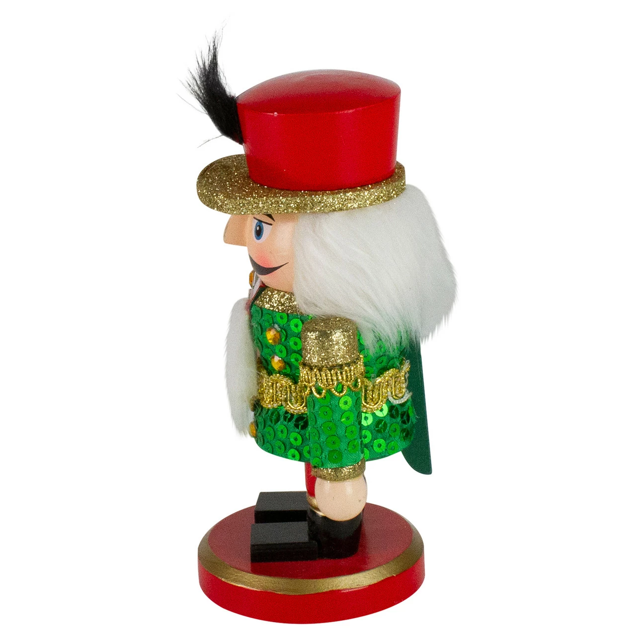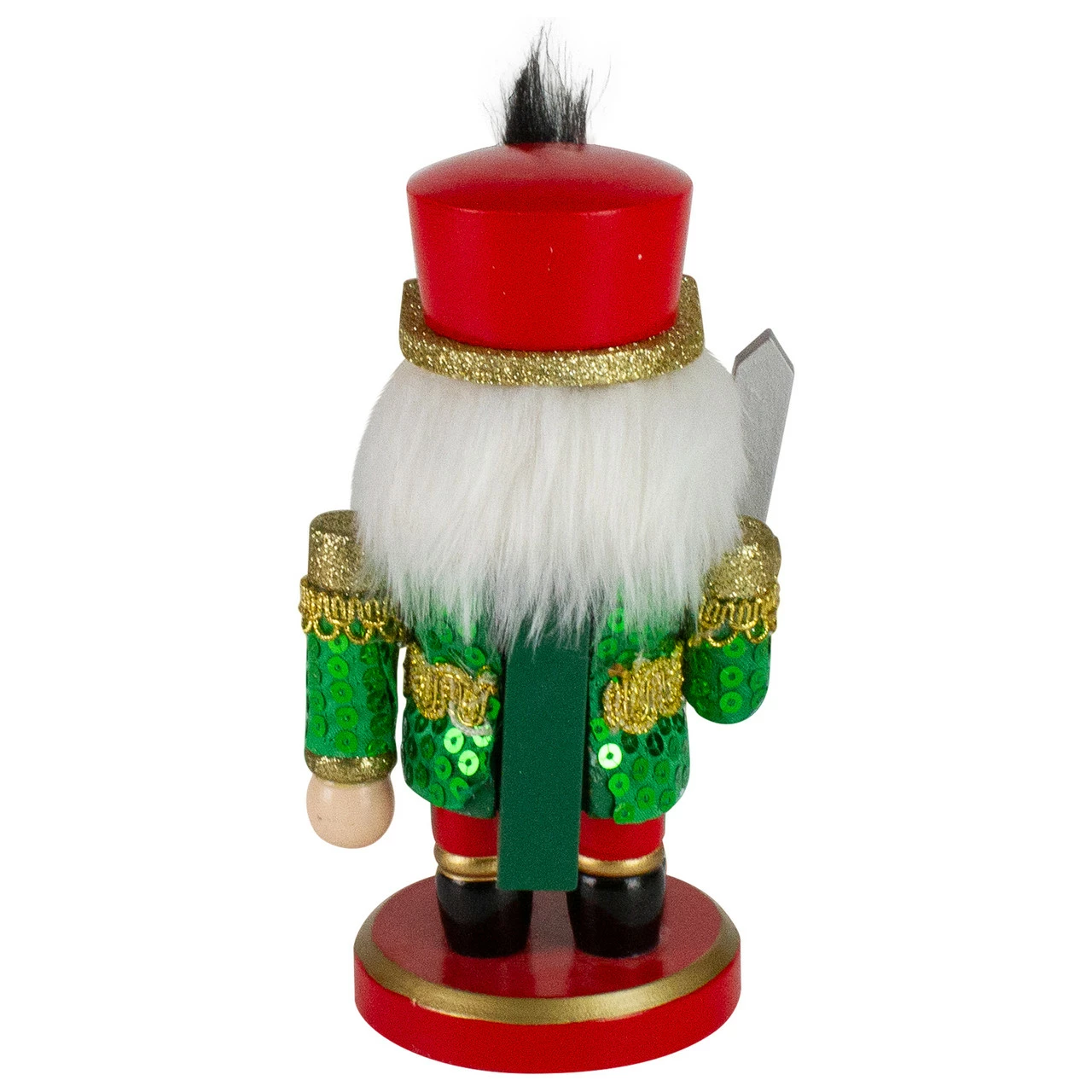 Chubby nutcracker is dressed in a green sequin jacket accented with gold gems, glitter, and tassels