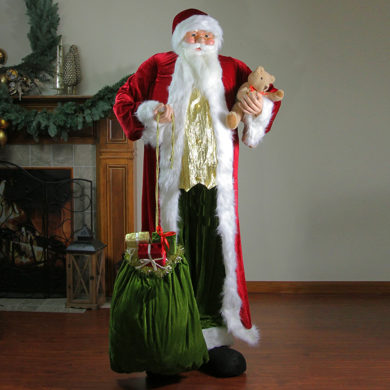 Santa’s green velvet toy bag is accented with a gold garland