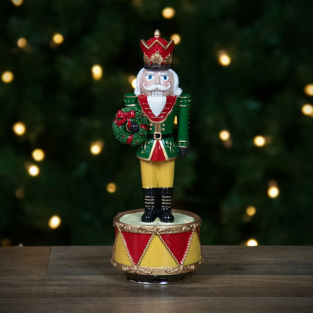 Nutcracker is wearing a green, red and yellow suit and holds a Christmas wreath