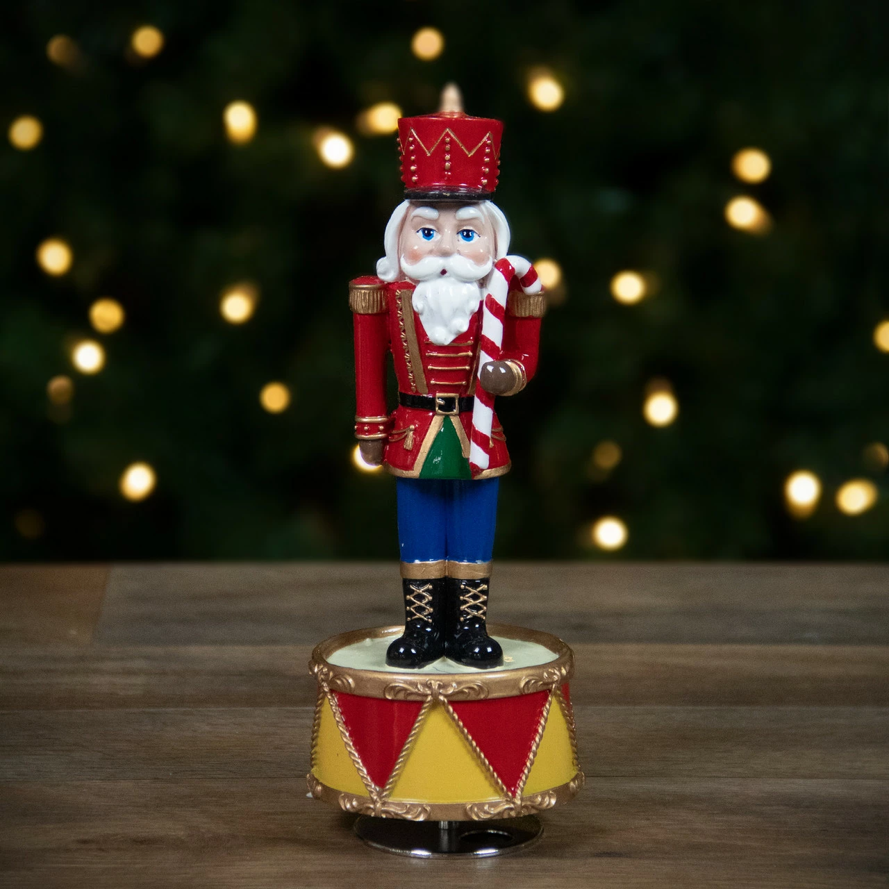 Nutcracker is wearing a red, green and blue suit and holds a candy cane