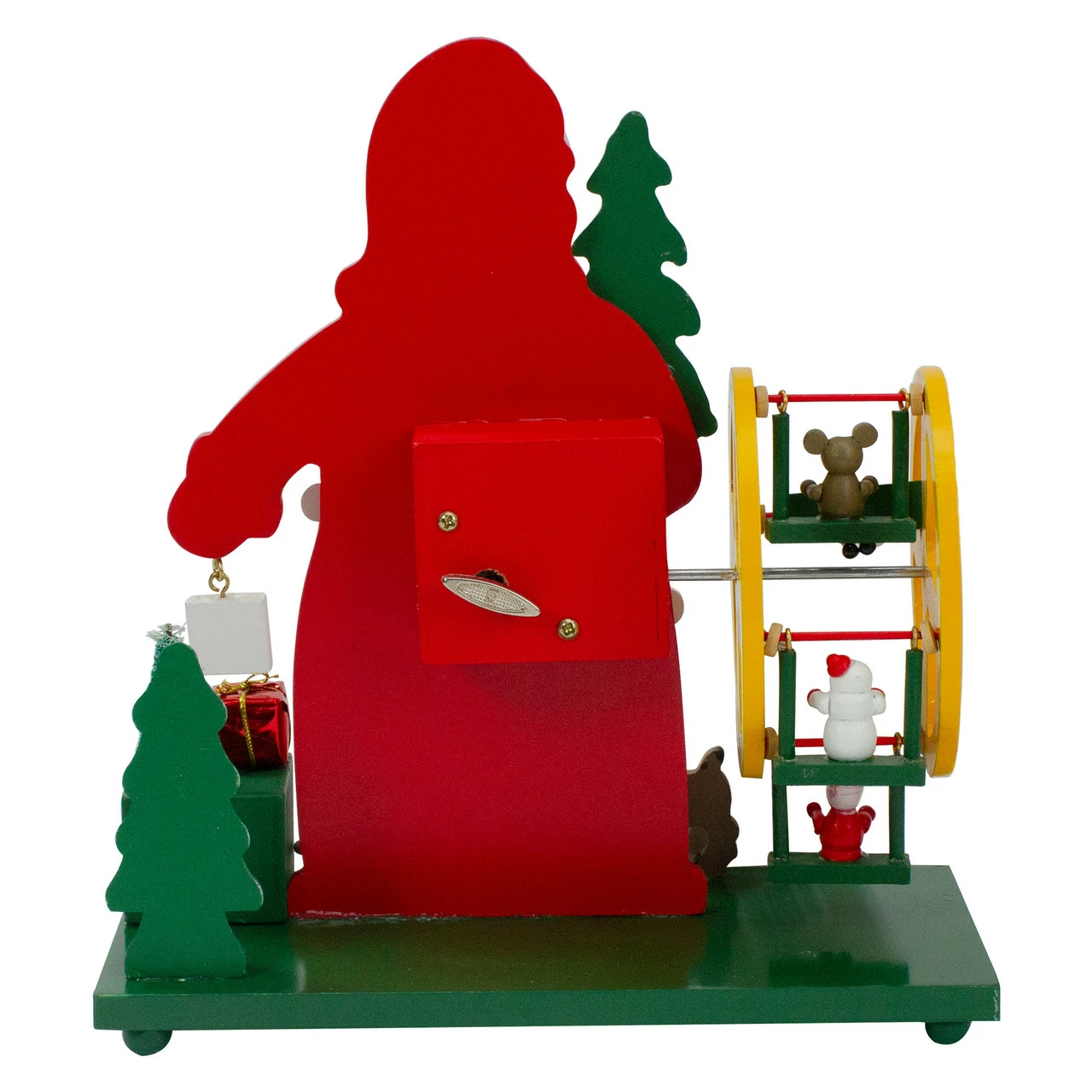 Ferris wheel with snowmen, an elf, and a mouse rotates while a large snowflake turns