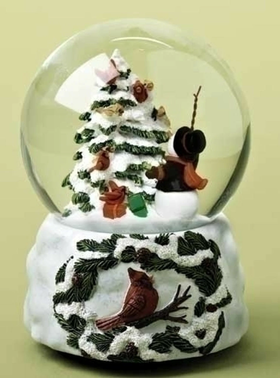 Glitterdome features a snowman conducting a chorus made up of cardinal birds